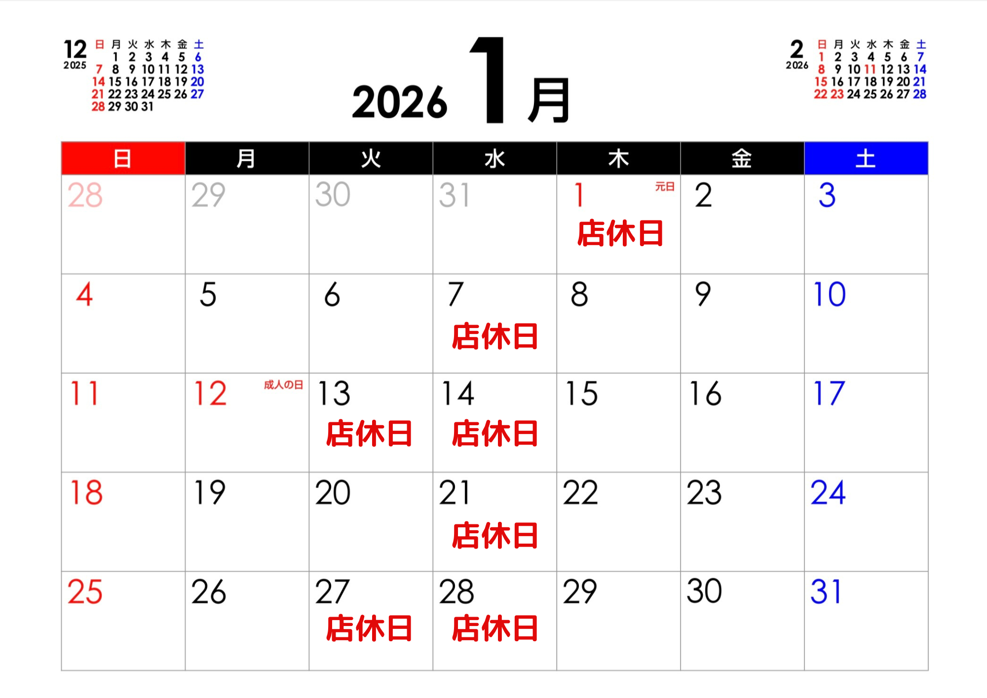 1月の店休日は、1日(木)・7日(水)・13日(火)・14日(水)・21日(水)・27日(火)・28日(水) です。