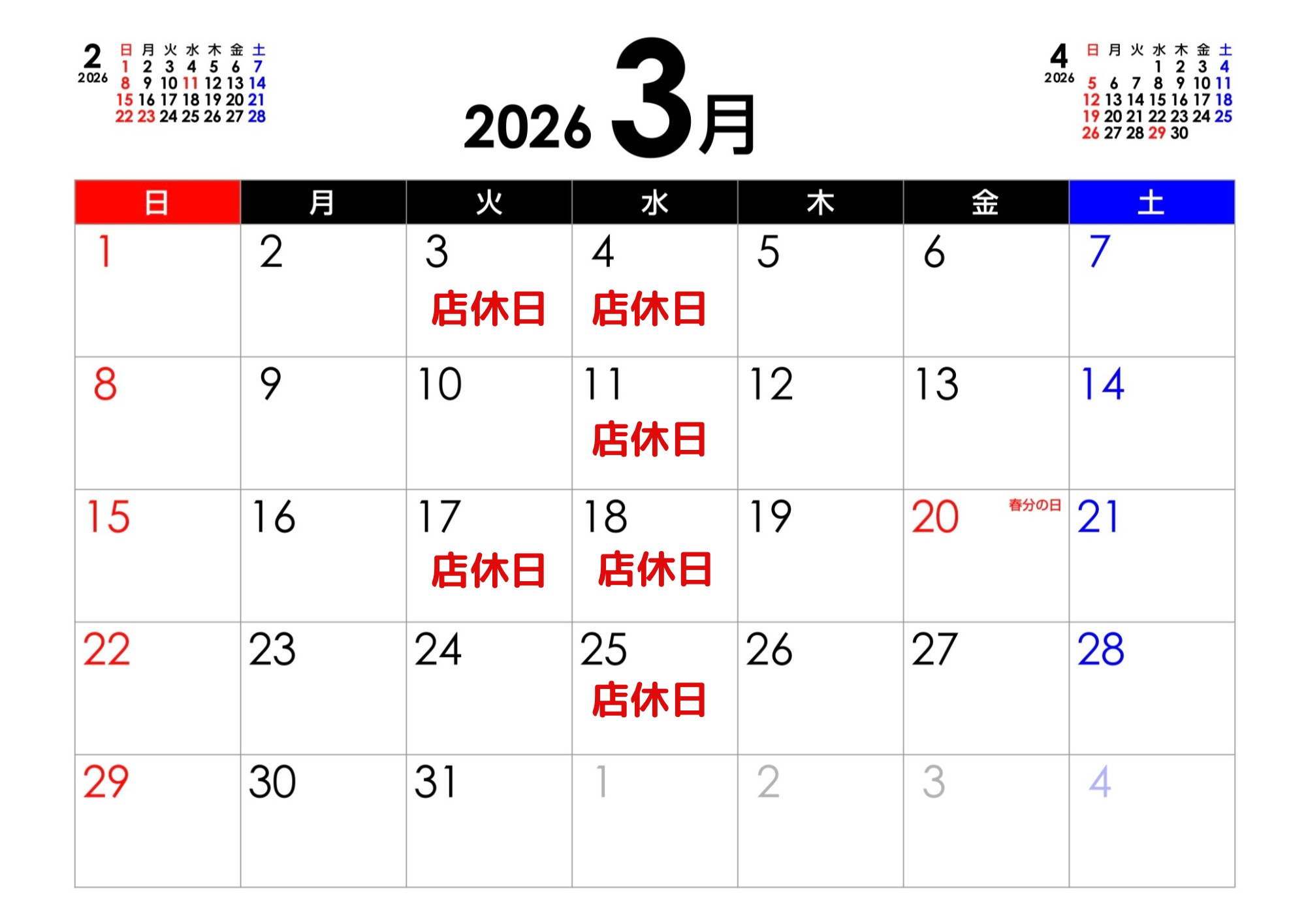 3月の店休日は、3日(火)・4日(水)・11日(水)・17日(火)・18日(水)・25日(水) です。
